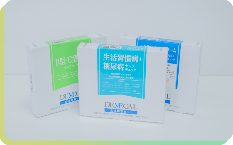 自宅で、自分で、血液検査! DEMECAL(デメカル)は、指先のほんのわずかな血液でできる在宅血液検査キットです。採血は約5分です。